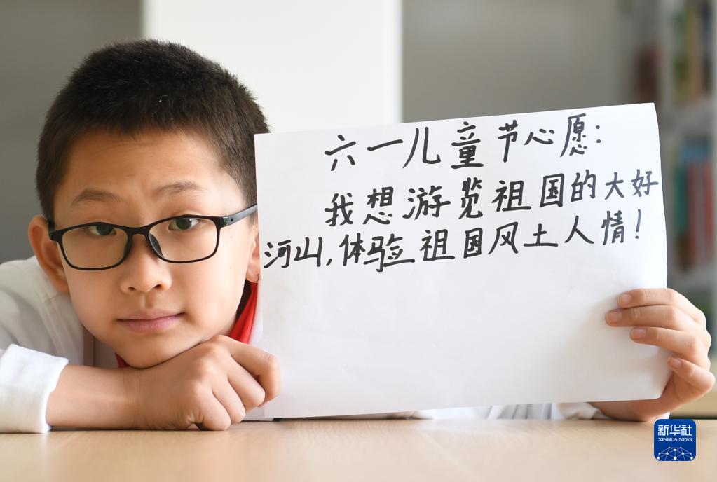 河北雄安新區容東片區容和悅容小學(xué)四年級三班張瀚睿展示“六一”微心愿(5月24日攝)。