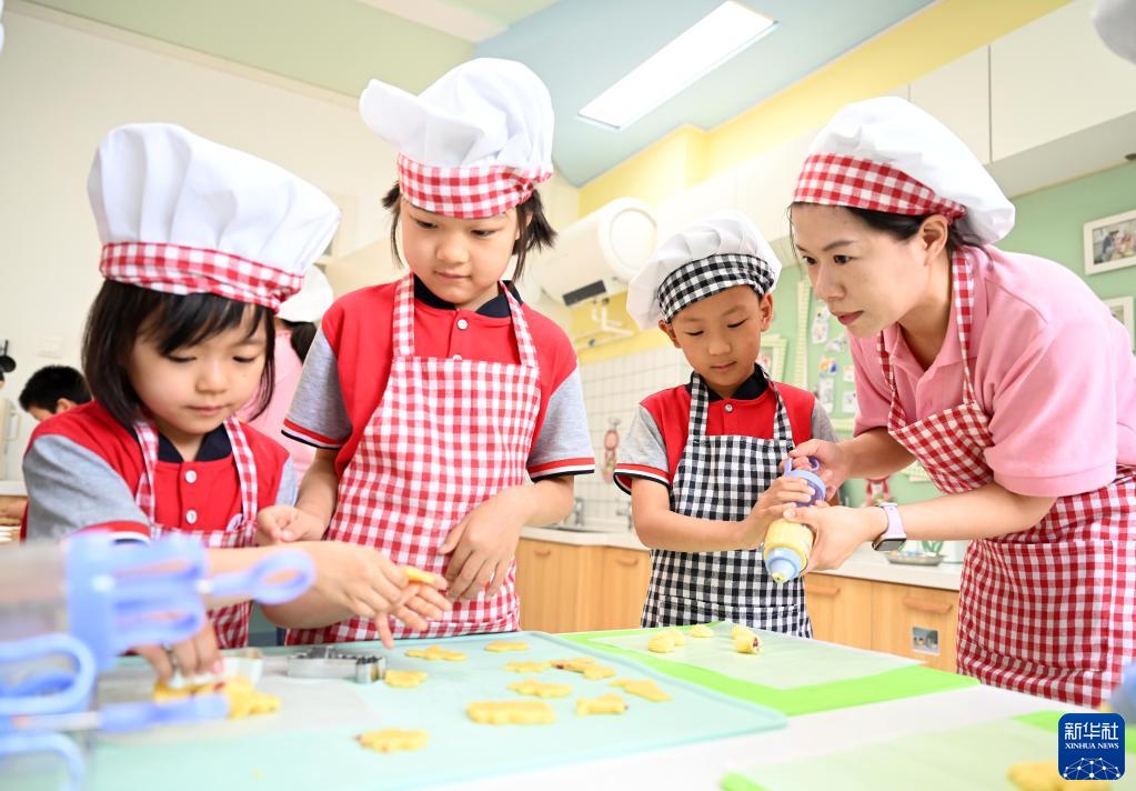 5月31日,在天津市和平區第五幼兒園,小朋友在勞動(dòng)教育系列活動(dòng)上體驗面點(diǎn)制作。