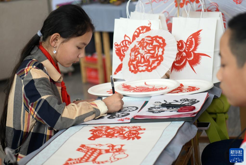 5月31日,在新疆烏魯木齊縣新時(shí)代文明實(shí)踐中心,烏魯木齊縣小渠子中學(xué)學(xué)生在手工藝展示活動(dòng)中制作剪紙。