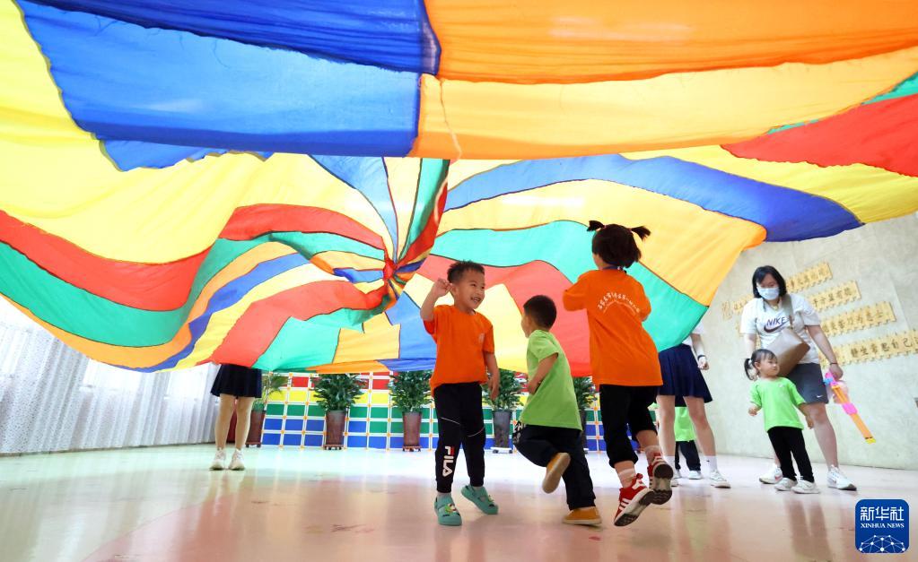 5月31日,在石家莊市長(cháng)安區第一幼兒園,孩子們進(jìn)行“遇見(jiàn)彩虹”親子游戲。