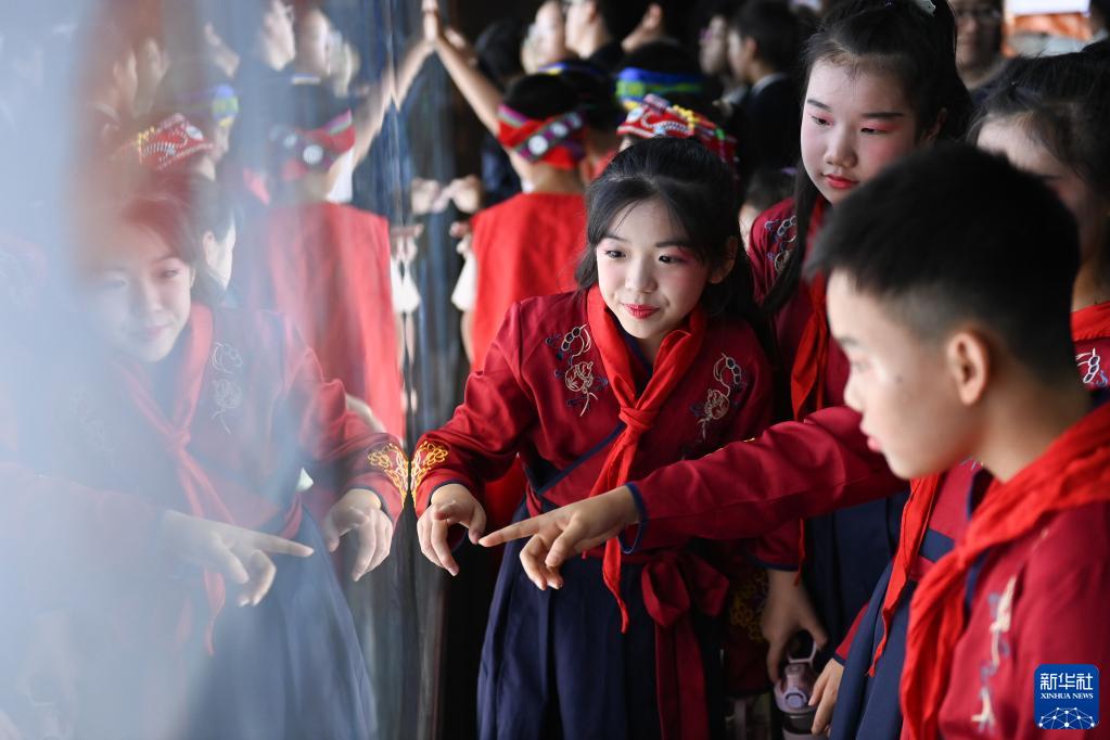5月31日,在浙江省湖州市吳興區八里店鎮潞村“典籍里的中國”陳列館,參加“誦讀國學(xué)經(jīng)典 傳承華夏氣韻”主題活動(dòng)的小學(xué)生體驗展廳的互動(dòng)環(huán)節。
