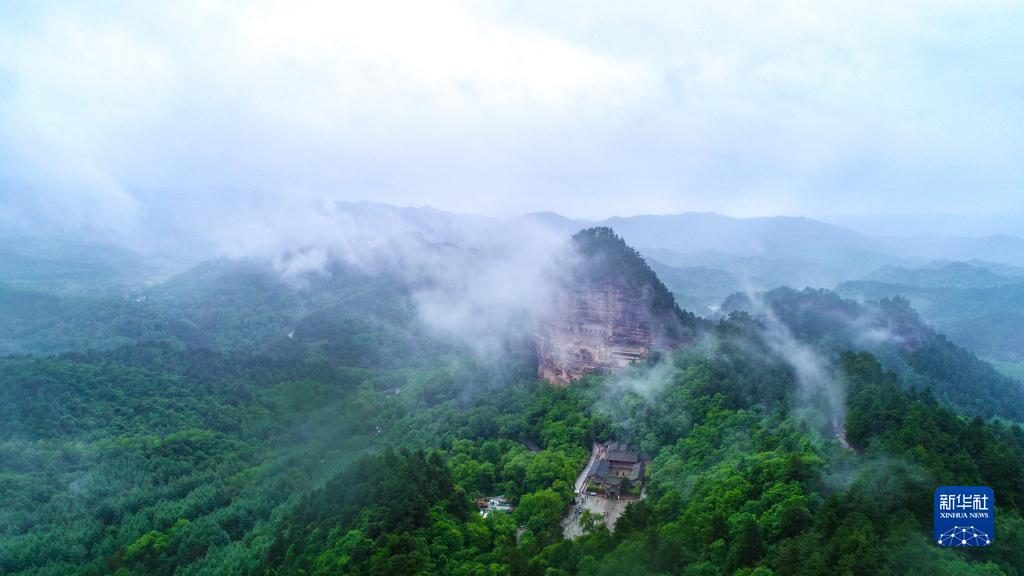 這是5月31日拍攝的煙雨籠罩下的麥積山石窟(無(wú)人機照片)。