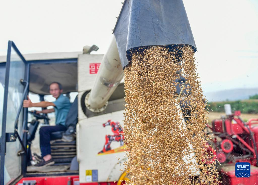 5月31日,在河南省洛陽(yáng)市偃師區大口鎮鐵村的麥田里,聯(lián)合收割機在收獲小麥。