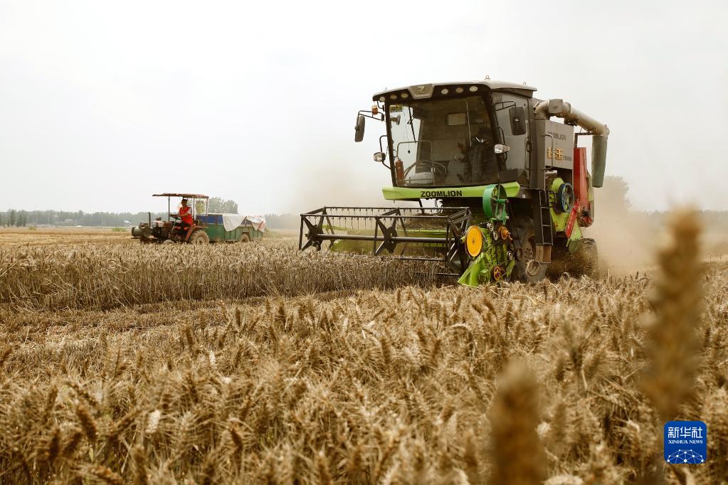 5月31日,聯(lián)合收割機在河南省開(kāi)封市尉氏縣南曹鄉前孫村的麥田里搶收小麥。