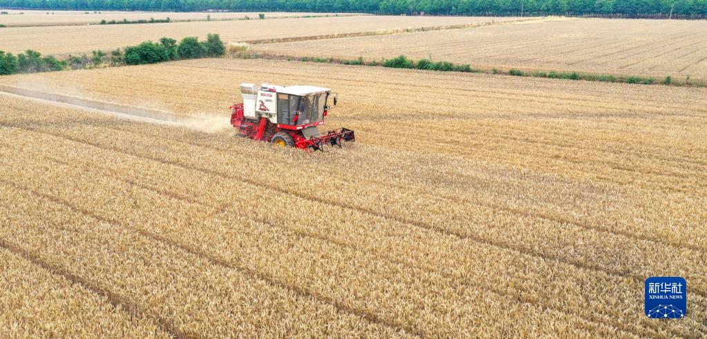 5月31日,在河南省洛陽(yáng)市瀍河區白馬寺鎮翟泉村,聯(lián)合收割機在搶收小麥(無(wú)人機照片)。