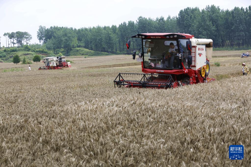 5月31日,聯(lián)合收割機在河南省駐馬店市驛城區朱古洞鄉五道廟村的麥田里搶收小麥。