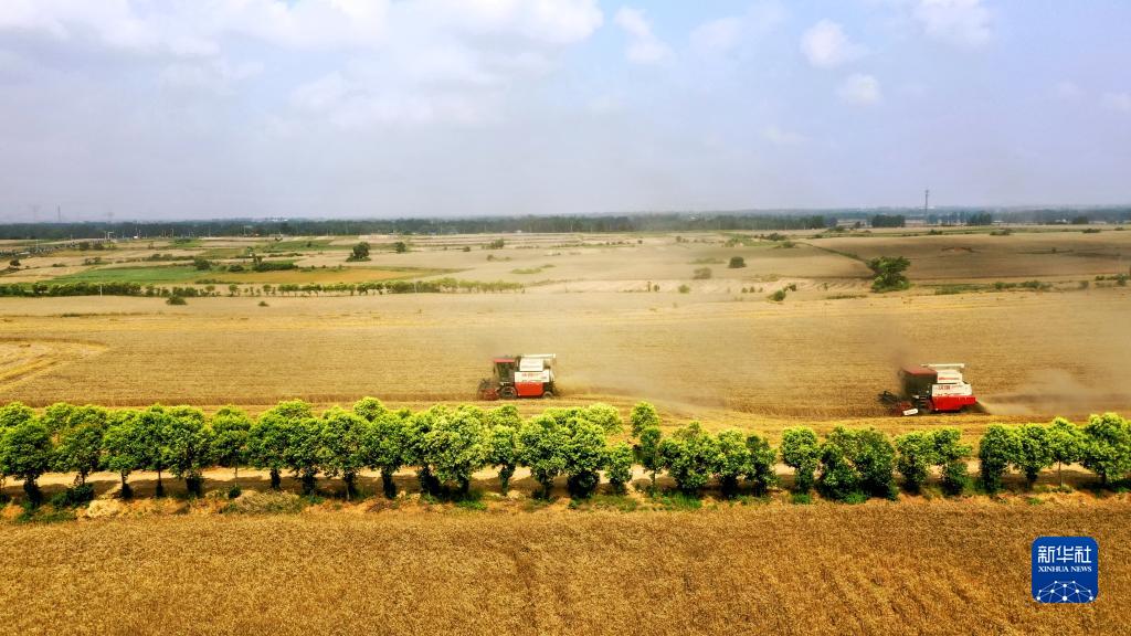 5月31日,聯(lián)合收割機在河南省南陽(yáng)市臥龍區謝莊鎮王營(yíng)村的麥田里收割小麥。