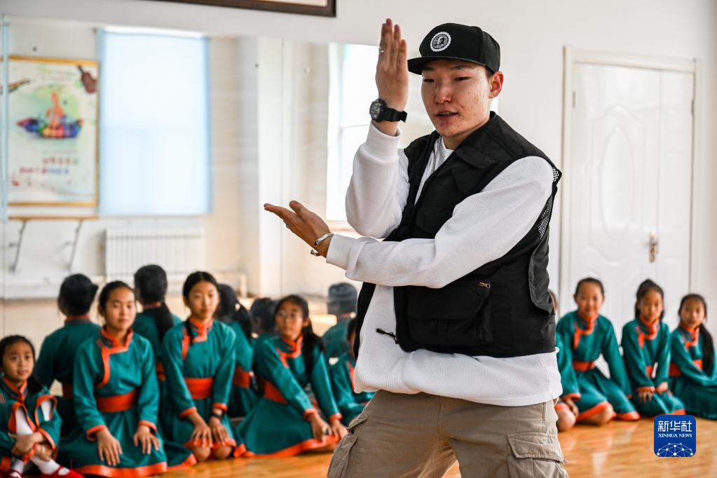 5月31日,蘇尼特右旗烏蘭牧騎隊員為“小小烏蘭牧騎”隊員表演街舞。