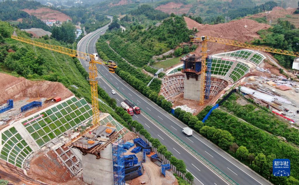 5月31日拍攝的西十高鐵陜西段山陽(yáng)跨福銀高速特大橋施工現場(chǎng)(無(wú)人機照片)。