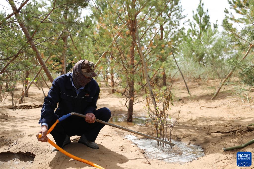 5月31日,治沙工人在庫布其沙漠億利生態(tài)治理區內管護樹(shù)木。