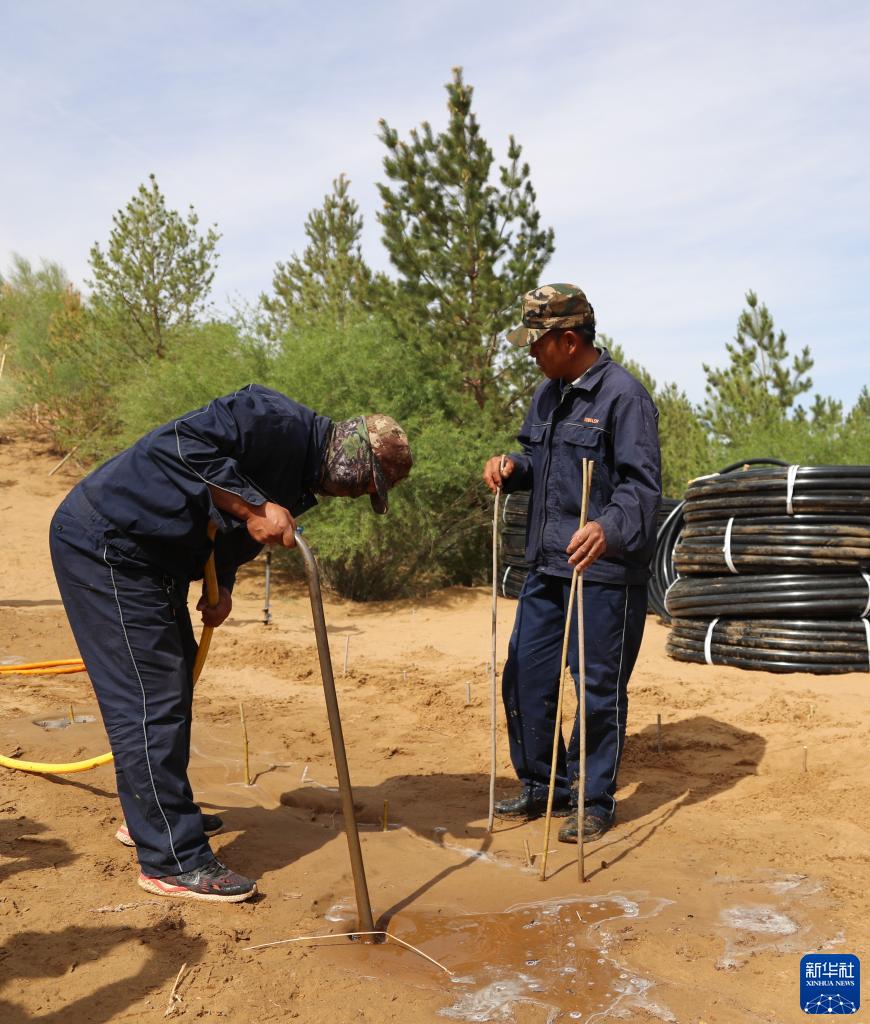 5月31日,治沙工人在庫布其沙漠億利生態(tài)治理區用微創(chuàng )氣流植樹(shù)法種植樹(shù)木。