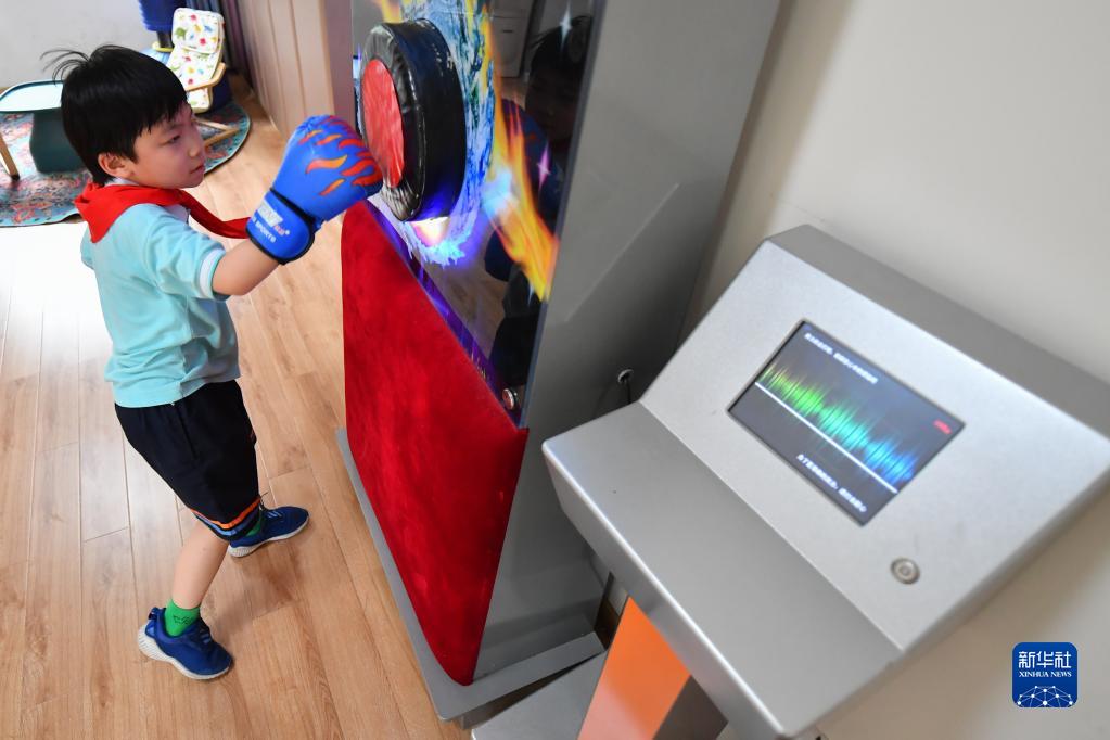 5月31日,在長(cháng)沙市岳麓區實(shí)驗小學(xué)“心語(yǔ)花溪”心理成長(cháng)中心的情緒宣泄室,學(xué)生通過(guò)打拳擊放松心情。