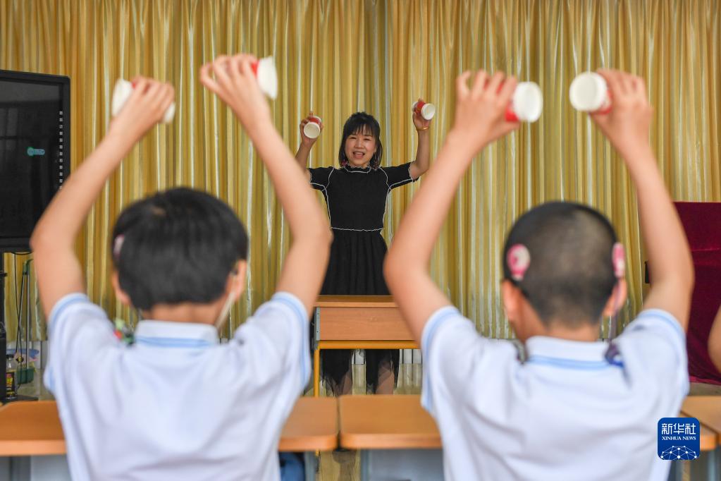 5月31日,在四平市聾啞學(xué)校,教師李洪敏(中)為殘障學(xué)生們上律動(dòng)課。