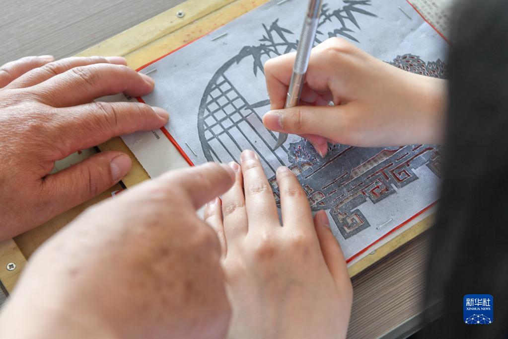 5月31日,在四平市聾啞學(xué)校,教師霍明燚教授殘障學(xué)生紙刻技藝。