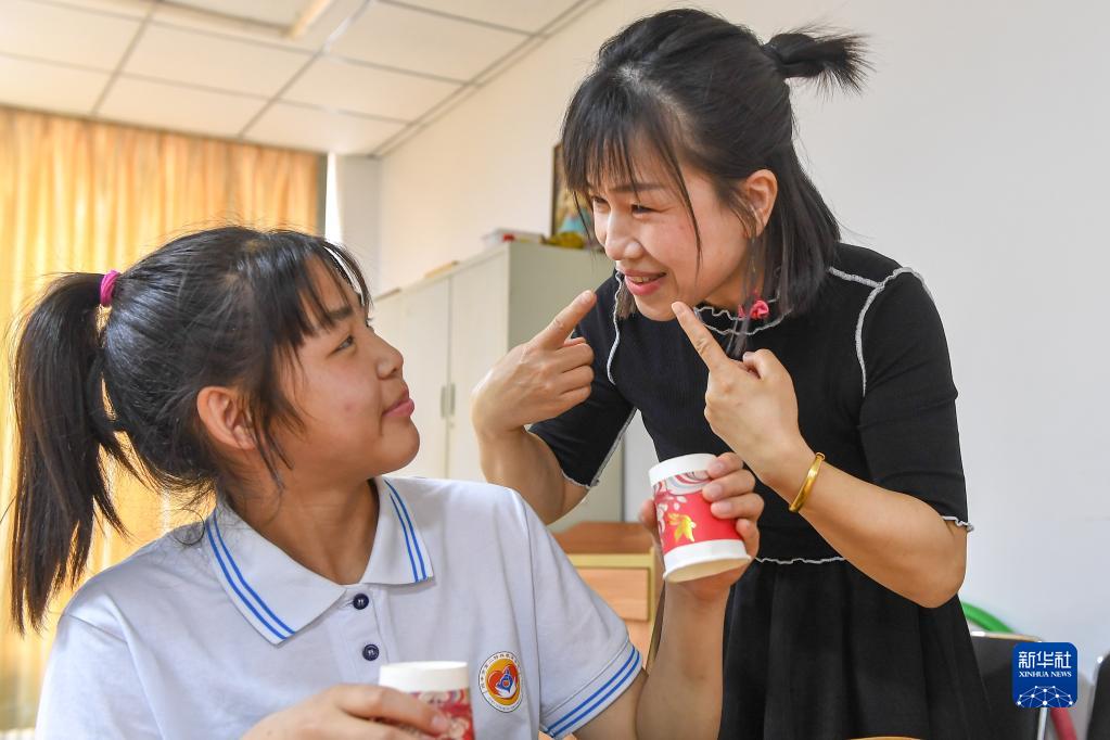 5月31日,在四平市聾啞學(xué)校,教師李洪敏(右)為殘障學(xué)生上律動(dòng)課。