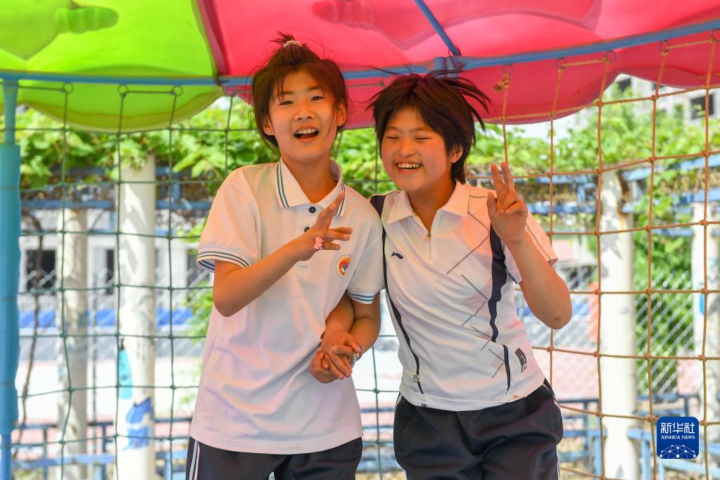 5月31日,在四平市聾啞學(xué)校,兩位殘障學(xué)生進(jìn)行課間游戲。