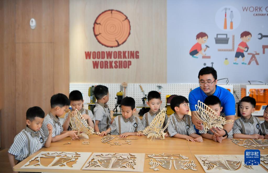 6月1日,在天津華夏未來(lái)兒童科技館,孩子們在老師的指導下體驗木工創(chuàng )作。