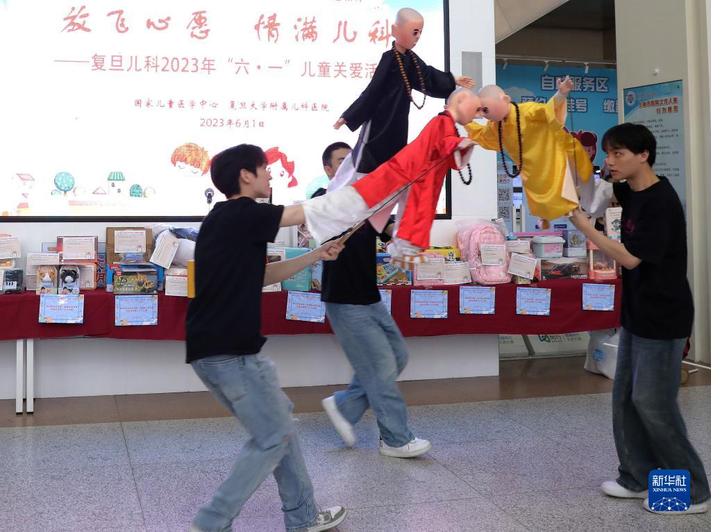 6月1日,在復旦大學(xué)附屬兒科醫院的門(mén)診大廳,上海戲劇學(xué)院木偶專(zhuān)業(yè)的大學(xué)生志愿者在表演木偶劇。