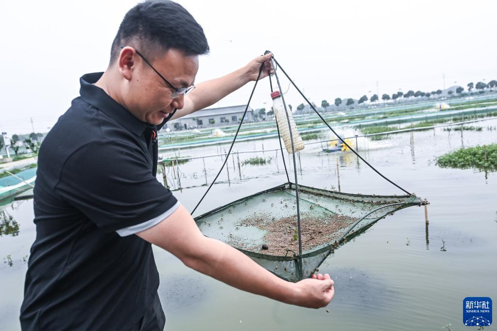 6月1日,欒金祥在浙江省湖州市織里鎮湖星農業(yè)科技有限公司的湖蟹養殖基地內查看湖蟹的生長(cháng)情況。欒金祥是美國紐約州立大學(xué)碩士畢業(yè),回國后在家鄉投身現代農業(yè)管理,帶動(dòng)蟹農創(chuàng )收,2022年公司湖蟹養殖銷(xiāo)售額達5000萬(wàn)元人民幣。
