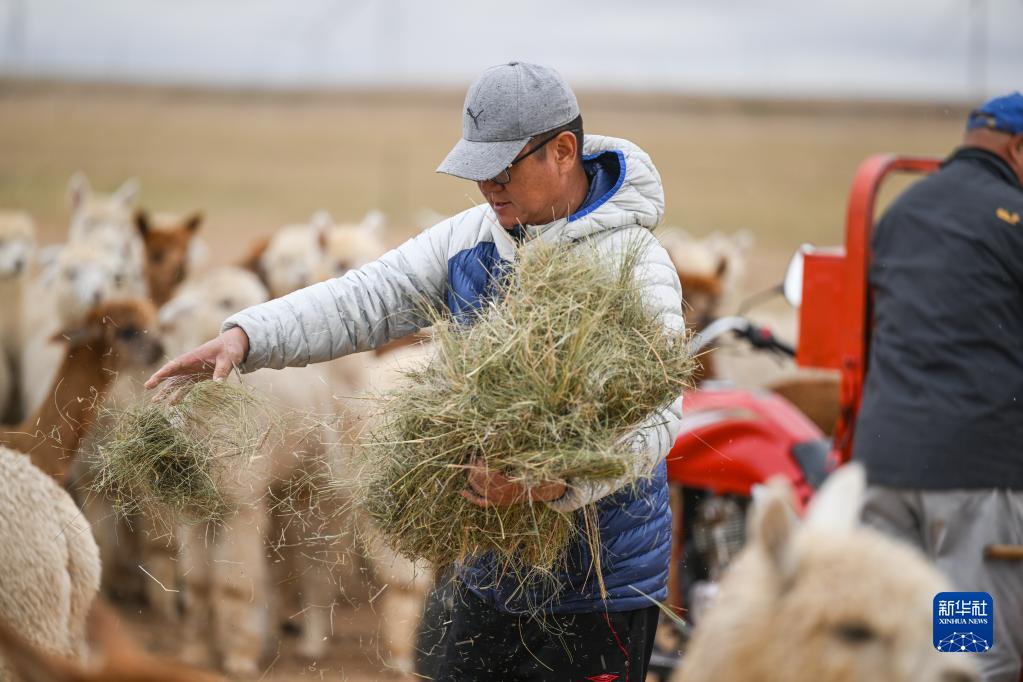 6月1日,巴彥杭蓋嘎查羊駝養殖基地的工作人員給羊駝喂食。