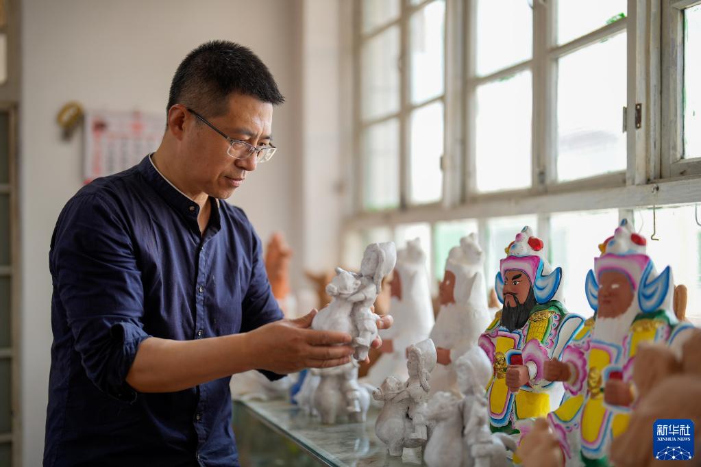 6月1日,泥塑藝人在河北省玉田縣亮甲店鎮的一家泥塑工作室內整理泥塑半成品。