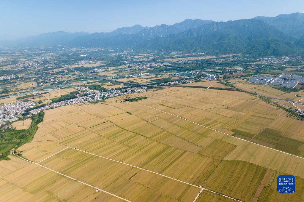西安市長(cháng)安區神禾塬萬(wàn)畝優(yōu)質(zhì)糧食生產(chǎn)基地上陸續成熟的麥田(5月30日攝,無(wú)人機照片)。