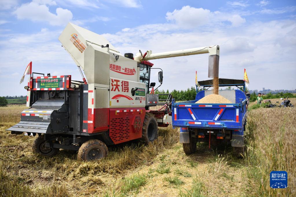 6月1日,在西安市長(cháng)安區王曲街道皇甫村的麥田內,收割機將收獲的小麥裝車(chē)。