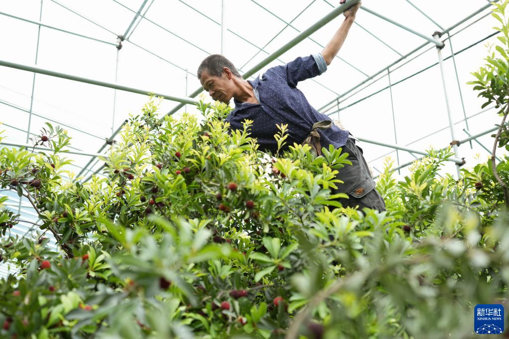 6月1日,在余姚市三七市鎮石步村,果農在大棚內采摘成熟的楊梅。