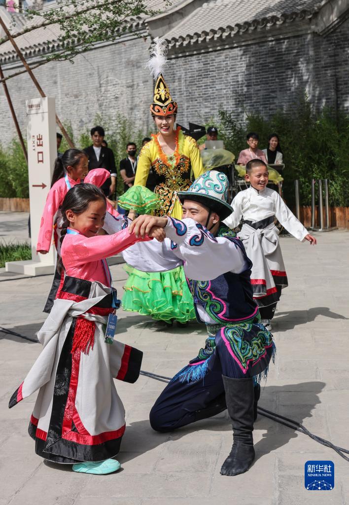 6月1日,來(lái)自玉樹(shù)州的孩子們在北京蒙藏學(xué)校舊址和中央民族歌舞團的演員互動(dòng)。
