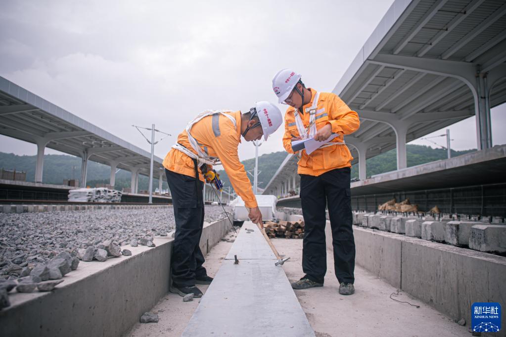 6月1日,寧波工務(wù)段金甬鐵路提前介入組的工人對建設中的嵊州站車(chē)站附屬設施進(jìn)行檢測。