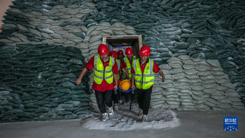 6月1日,工作人員在應急演練中使用擔架轉運“重傷員”。