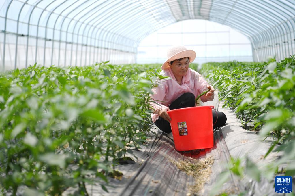 6月1日,河北雄安新區安新縣陽(yáng)雀湖西里現代農業(yè)產(chǎn)業(yè)園區工人在采摘辣椒。