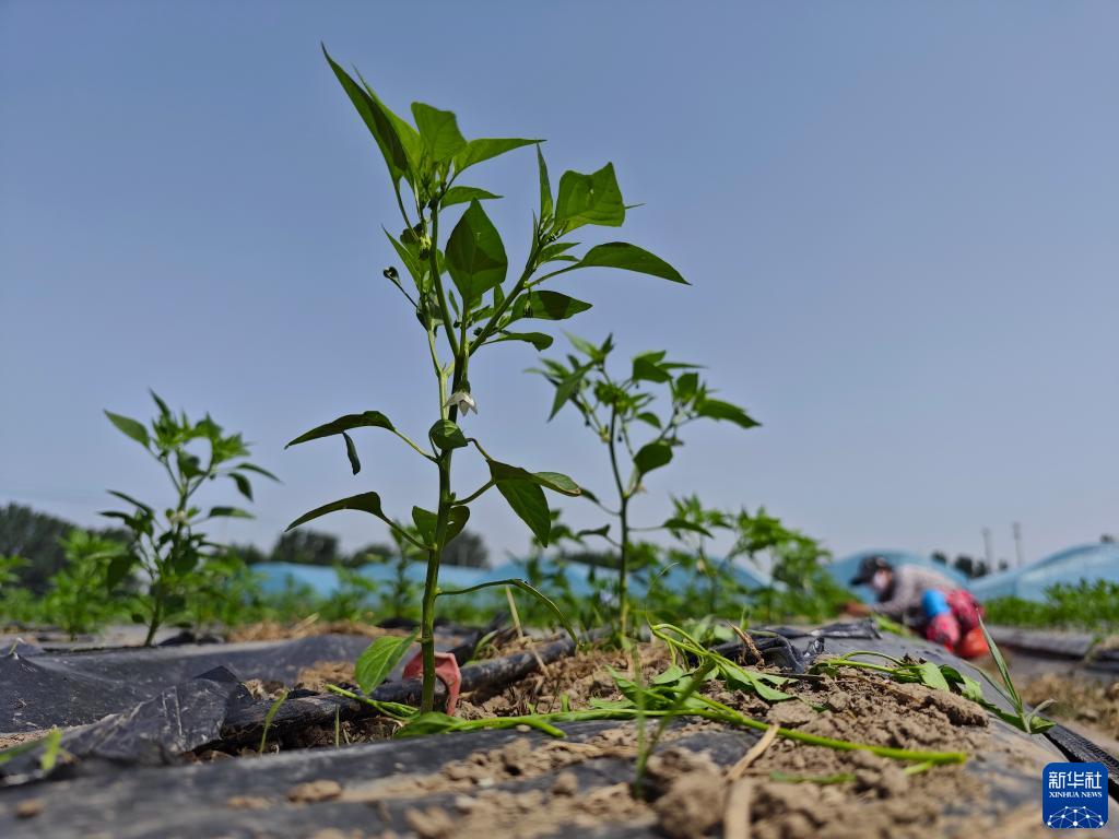 6月1日,河北雄安新區安新縣陽(yáng)雀湖西里現代農業(yè)產(chǎn)業(yè)園區工人在管護辣椒秧苗。