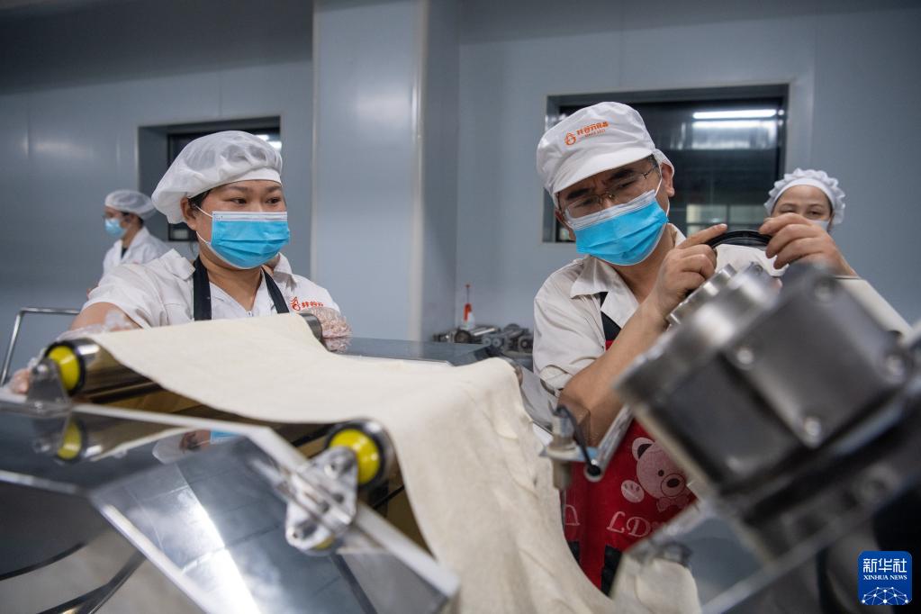 6月1日,在位于重慶市大渡口區的井谷元食品科技有限公司生產(chǎn)車(chē)間內,工人在小面生產(chǎn)線(xiàn)上進(jìn)行調試作業(yè)。