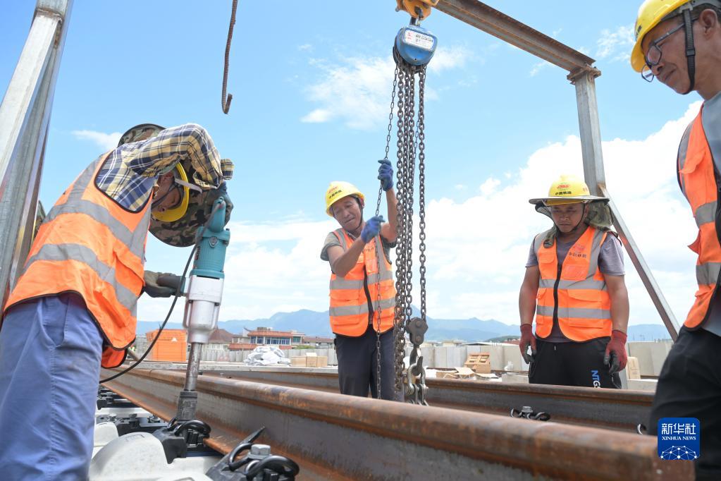 6月1日,中鐵十一局施工人員在福州濱??炀€(xiàn)蓋山站至帝封江站區間高架段施工作業(yè)。