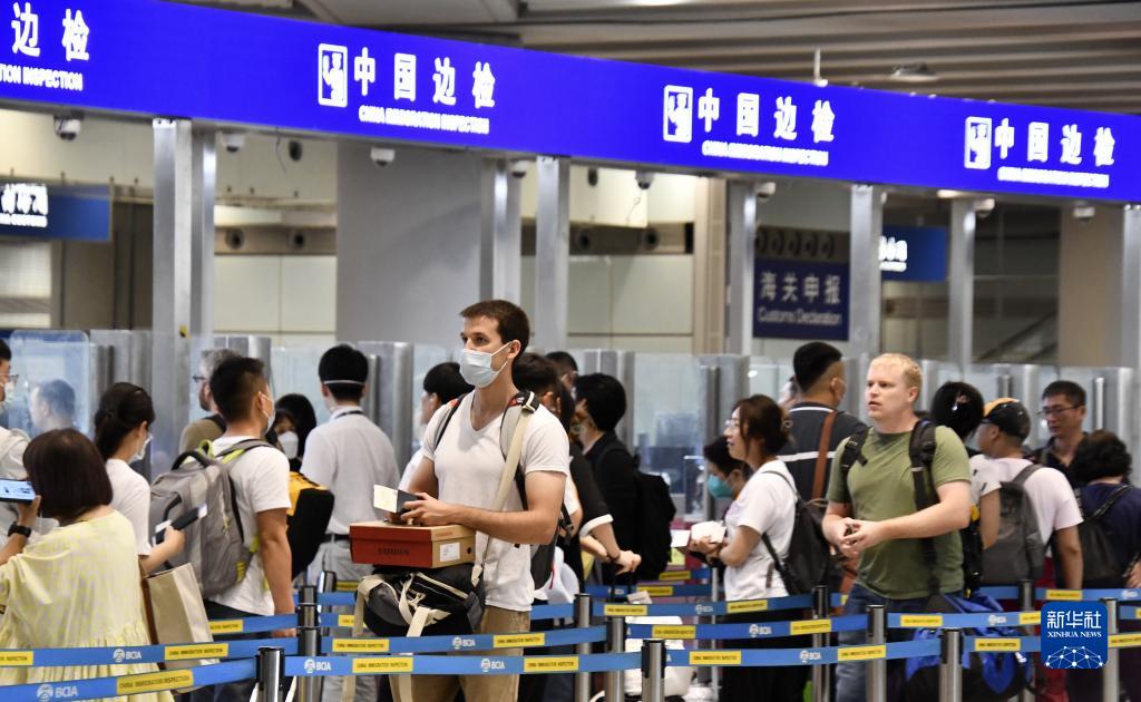 6月1日,旅客從首都國際機場(chǎng)邊防檢查站出境。