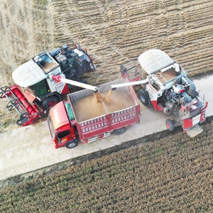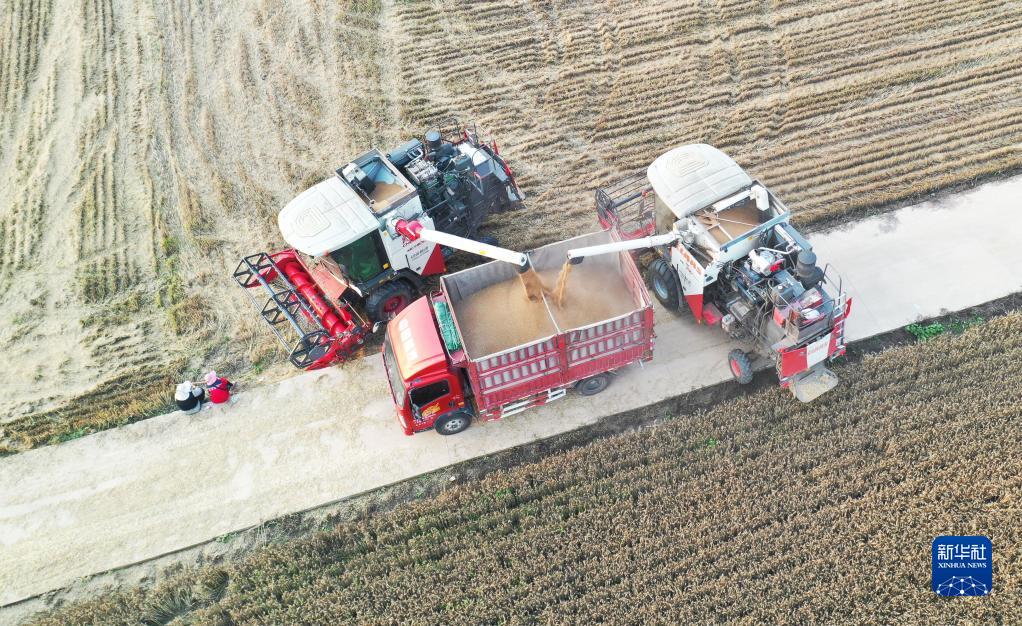 6月1日,在河南省駐馬店市上蔡縣邵店鎮后楊村,收割機將收獲的小麥裝車(chē)(無(wú)人機照片)。