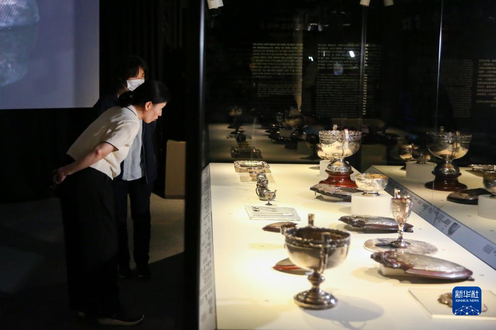 6月1日,人們在韓國首爾歷史博物館參觀(guān)“海上銀珠·璀璨華光——上海市歷史博物館館藏銀器展”。新華社記者 王益亮 攝