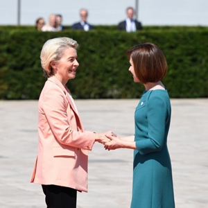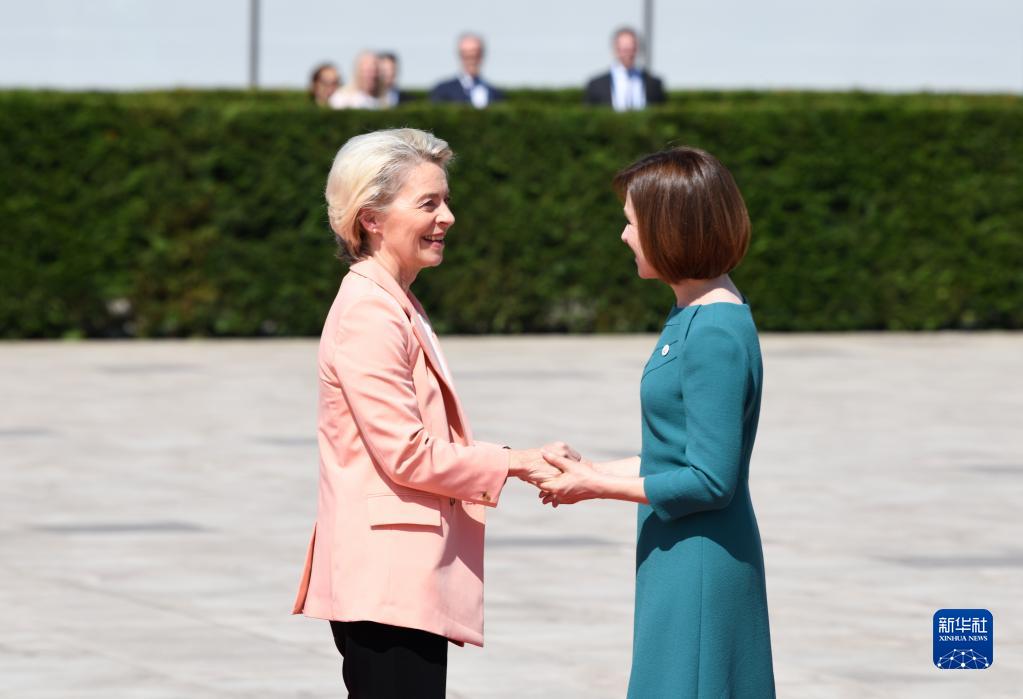 6月1日,在摩爾多瓦布爾博阿克,摩爾多瓦總統桑杜(右)歡迎前來(lái)參加第二屆歐洲政治共同體領(lǐng)導人會(huì )議的歐盟委員會(huì )主席馮德萊恩。