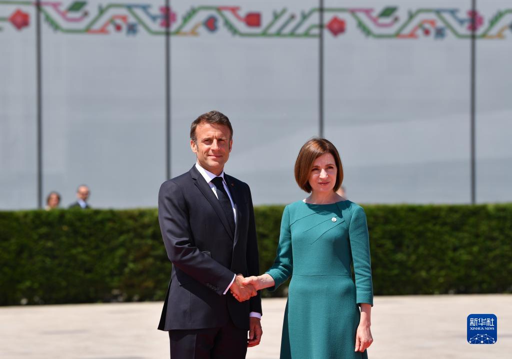 6月1日,在摩爾多瓦布爾博阿克,摩爾多瓦總統桑杜(右)歡迎前來(lái)參加第二屆歐洲政治共同體領(lǐng)導人會(huì )議的法國總統馬克龍。