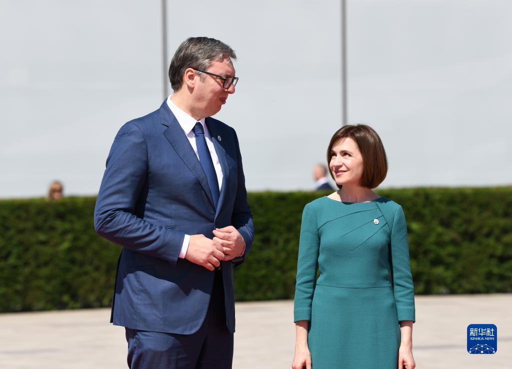 6月1日,在摩爾多瓦布爾博阿克,摩爾多瓦總統桑杜(右)歡迎前來(lái)參加第二屆歐洲政治共同體領(lǐng)導人會(huì )議的塞爾維亞總統亞歷山大·武契奇。