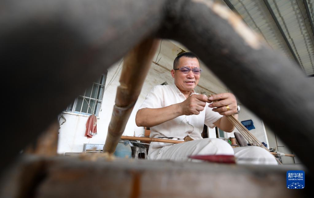6月1日,在廣西賓陽(yáng)縣賓州鎮陸村,陸云崗在制作油紙傘。