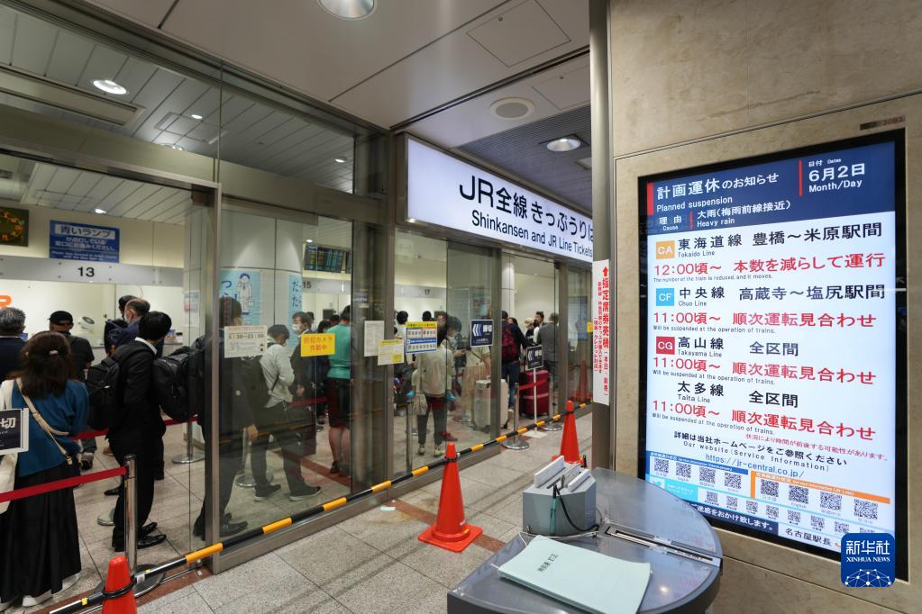 6月2日,人們在日本名古屋排隊購買(mǎi)車(chē)票,屏幕上顯示著(zhù)當日停運列車(chē)。