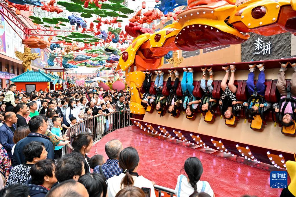 游人在四平市仁興里沉浸式文旅街區內體驗游樂(lè )設施(6月1日攝)。