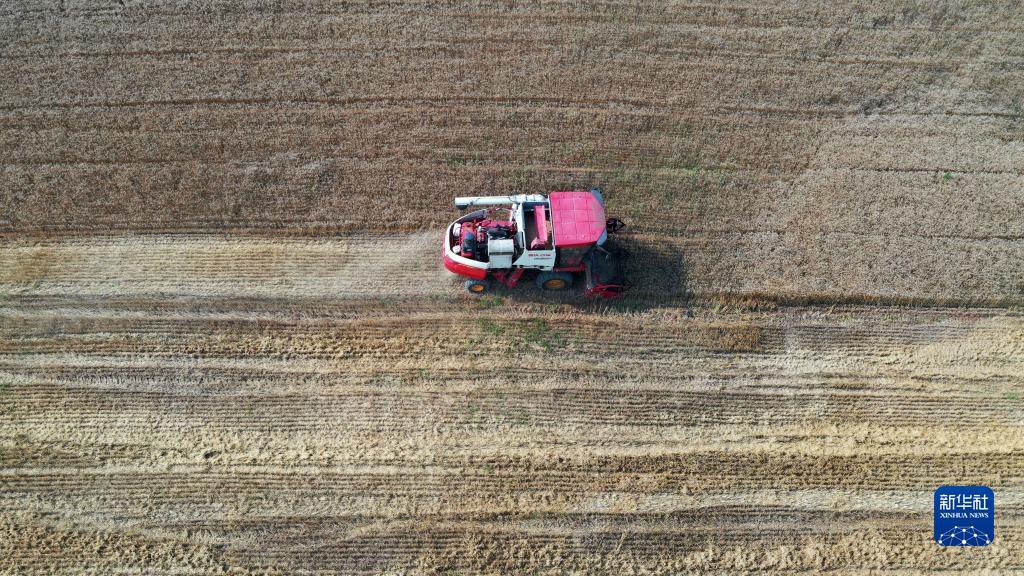 6月2日,在合肥市蜀山區小廟鎮段沖村,農機手操作機械設備收割小麥(無(wú)人機照片)。