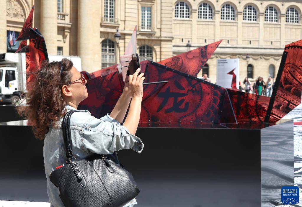 6月1日,游客在法國巴黎先賢祠廣場(chǎng)“龍的旅程”大型藝術(shù)展前拍照。