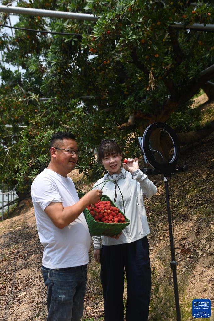 6月2日,蔥坑村返鄉青年人才林靈(左)和妻子一起在楊梅林里直播售賣(mài)楊梅。