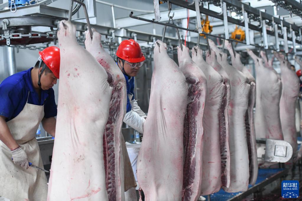 在黑龍江省鐵力市的18萬(wàn)頭生豬屠宰項目生產(chǎn)線(xiàn)上,工作人員在作業(yè)(6月1日攝)。