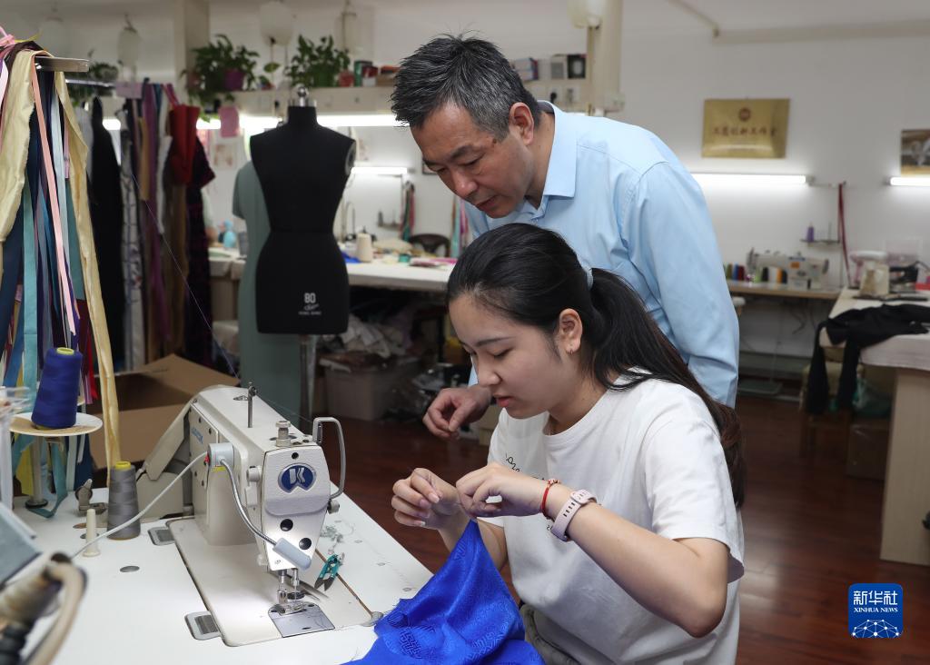 5月31日,江滿(mǎn)宗(后)在上海市“龍鳳旗袍制作技藝——國家級非物質(zhì)文化遺產(chǎn)傳習所”為徒弟吳雨婷傳授技藝。