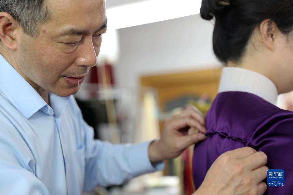 5月31日,江滿(mǎn)宗(左)在上海市“龍鳳旗袍制作技藝——國家級非物質(zhì)文化遺產(chǎn)傳習所”為顧客測量身材尺寸。